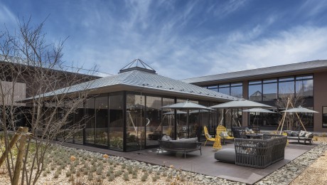 中庭の中央に位置し、施設の象徴となるバーラウンジ棟は柱・梁の架構表しの木造にて計画、トップライトからの柔らかな自然光と、室内外の緑を感じられる空間とした。全客室にインナーバルコニーを設け、外部の自然を感じながら滞在することができる。