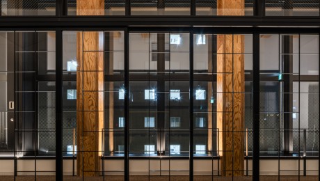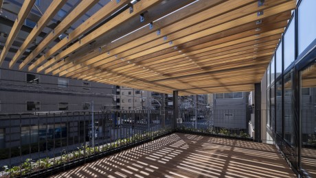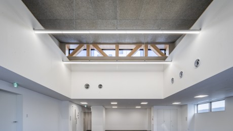一般流通材による新たな梁の組み方(レシプロカル架構)を考案し、木造による7.2mスパンの執務空間を確保した。