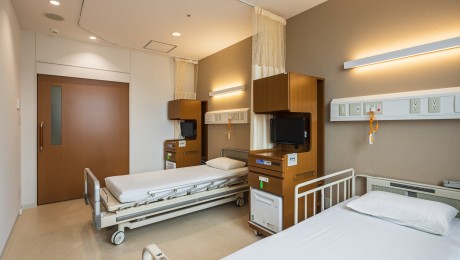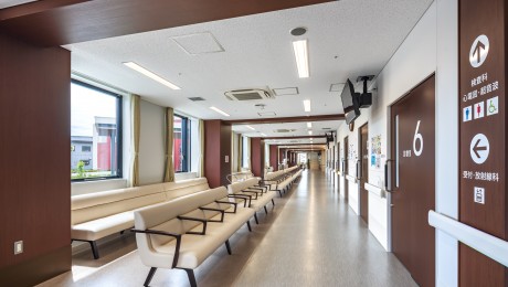 1階診療部門は外来ループ動線と外来・処置・検査を近接配置し、患者・職員動線の効率化を図った。また、外来待合スペースは南側に配置し、併設した休憩ラウンジとともに明るくゆとりのある空間とした。2階透析室は長時間の治療を心穏やかに過ごせる療養環境とするため、間接照明の採用や木目柄を基調とした。