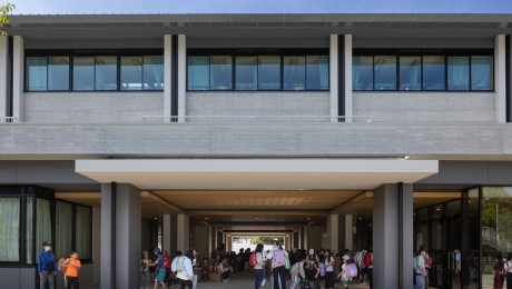 校舎を3階建とし、敷地境界よりセットバックする配置で計画。正門と建物の間に広場状の空地「みんなのにわ」を設け、地域の目の届きやすい明るい空間として再整備を行った。また、グラウンドに抜ける貫通路を設け、雨に濡れない昇降口前の空間と兼ねる計画としている。
