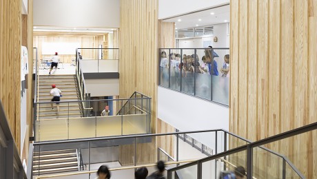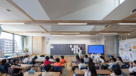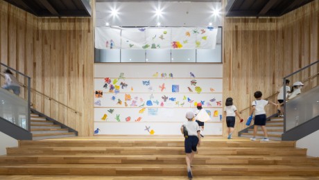 学校の中心となる「大階段」・「普通教室」・「みんなのみち」をはじめとした、児童が日常多く利用する空間に多く木質化を行い、木と触れ合える温かみのある学習環境を作り出した。