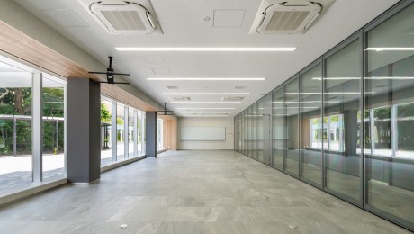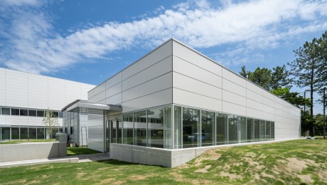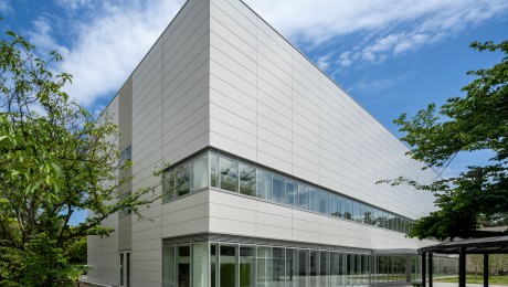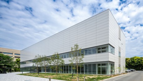 本棟は研究用途のほか、学生向けの講義室、産学連携を兼ねた事務室が設けられる。1階に講義室、2階に事務室、3階に研究室となるように配置し、セキュリティレベルに応じたフロアゾーニングとしている。また、内部用途に応じて階ごとの開口部率を変化させ、内外の統一を図った。別棟は本棟と近似したデザインとし、2棟が関連した施設であることを明確にしている。