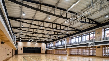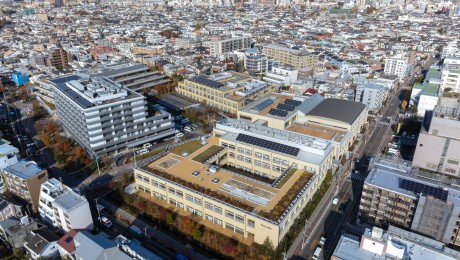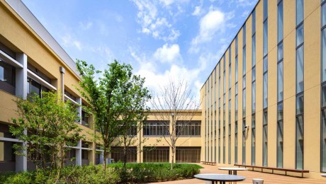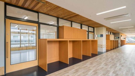 小中高等部の特別支援学校。西敷地と東敷地間の道路上空を空中歩廊で連結し、西・南棟にある普通教室は南東北に面したクラスターとして3学年毎に配置。メディアセンターを中心とした大スロープや生徒間・生徒教職員の交流を促すフリースペースを計画。職員室・体育館等の共同利用空間は中心の北棟に配置し、フラットな床やピロティ下スクールバス駐車場に直結する昇降口により段差なく移動。